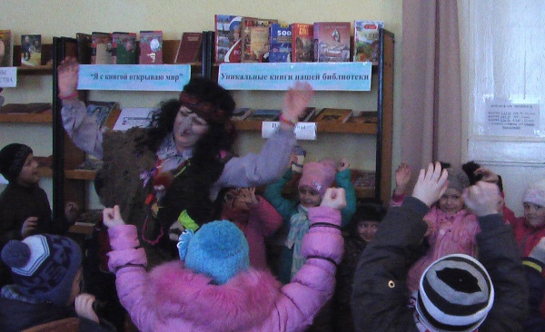 Библиотекарь в сказочном образе Бабы Яги встретила маленьких читателей и они вместе станцевали веселый танец.